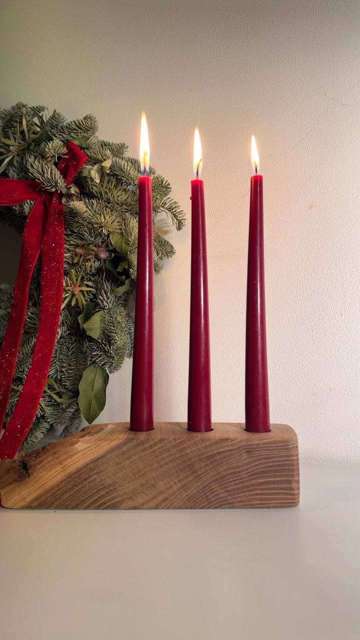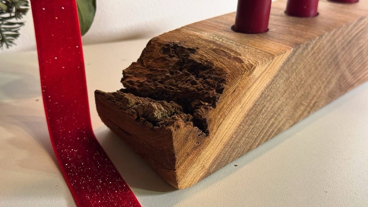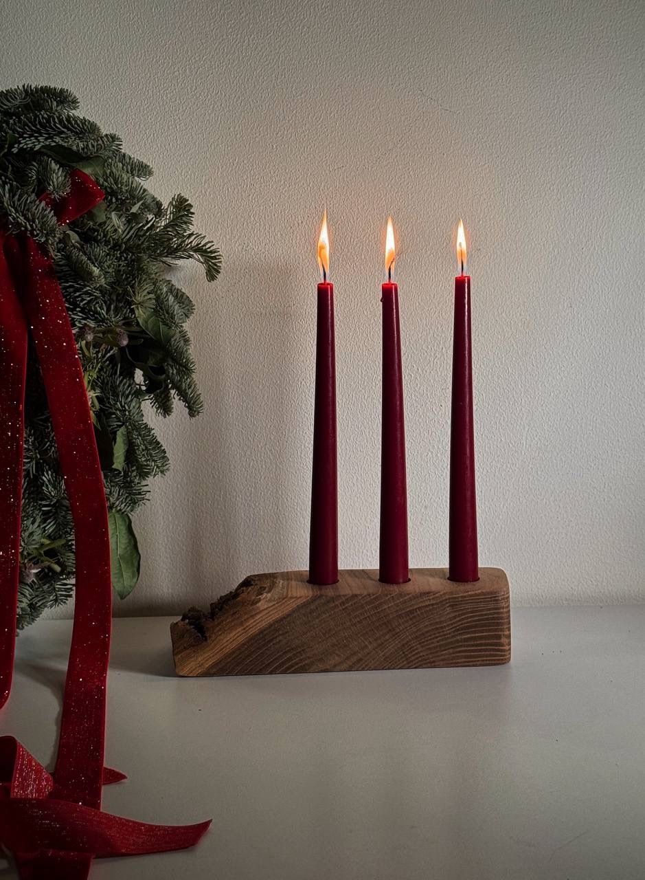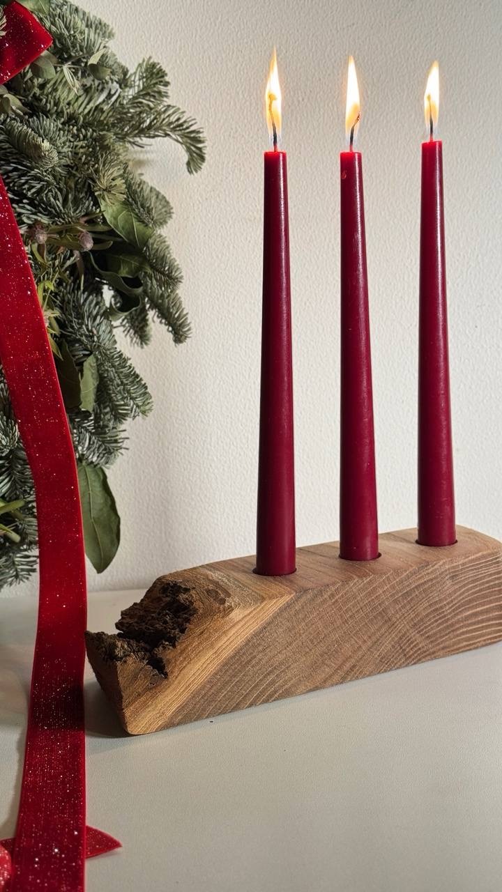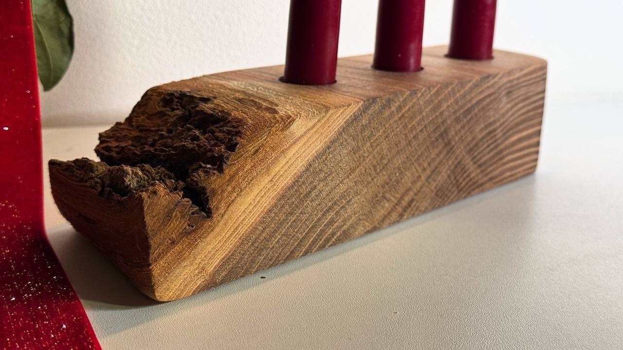 Деревянный подсвечник из массива благородного дерева карагач с уникальной структурой и корой с одной стороны. Подсвечник идеально отшлифован и обработан Подсвечник для трех столовых/античных свечей, диаметр отвестий 22 мм, соответсвует стандартным размерам оснований столовых свечей.